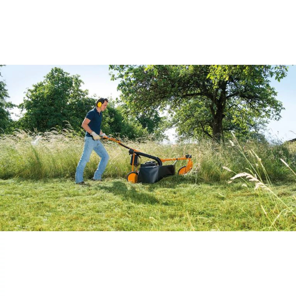 Az AS 21 E-Allmäher könnyedén elsajátítja az ívben történő nyírást. A forgó első kerék mechanikusan megállítható a helyén, így stabil és kényelmes nyírást biztosít enyhe lejtőn.