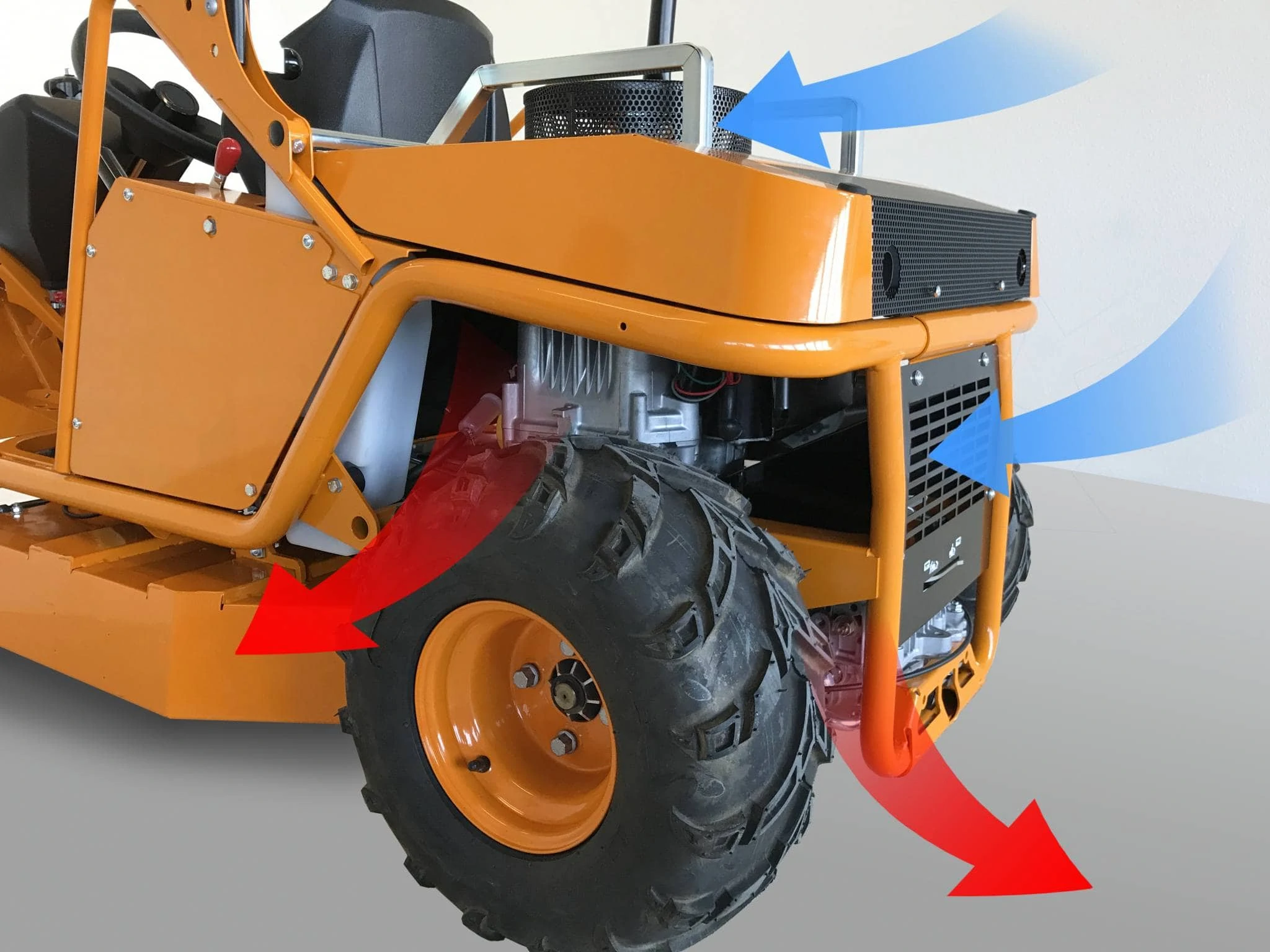 A motor és a hajtás elegendő mennyiségű friss hűtőlevegővel rendelkezik a külön bevezető és elszívó csövek miatt. Amíg a motor felülről szívja be a hűtőlevegőt, és oldalra üríti, a hidrosztatikus hajtás hátulról szívja fel a hűtőlevegőt, és lefelé továbbítja. A két különálló szellőzőkör megakadályozza, hogy a két elem egymásnak adja át a forró levegőt. Ez a rendszer az alkatrészek hosszabb élettartamát és megbízható védelmet nyújt a túlmelegedés ellen, még magas kültéri hőmérsékleten és nehéz felhasználás esetén is.